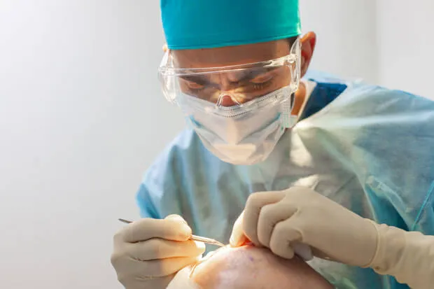 - メスを使用して頭皮ごと移植毛を採取し、皮膚を毛包単位に分けてから移植先に植え込む方法です。毛根を傷つけにくいことから定着率が高い傾向にあり、広い面積に移植することができるのが特徴です。メスを使った採取のため採取後に縫合をする必要がある、麻酔が切れた後に採取部に痛みを感じる、傷口の完治に時間がかかるなどのデメリットもあります。